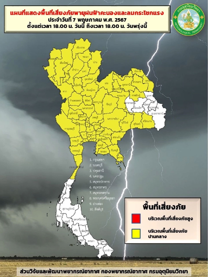 วัน 7 พ.ค. 67 แนวพัดสอบของลมตะวันออกเฉียงใต้และลมใต้พัดปกคลุมบริเวณภาคตะวันออกเฉียงเหนือ ภาคตะวันออก และภาคกลาง ลักษณะเช่นนี้ทำให้บริเวณดังกล่าวมีฝนฟ้าคะนอง ลมกระโชกแรง และมีฝนตกหนักบางพื้นที่ ในขณะที่ความกดอากาศต่ำเนื่องจากความร้อนยังคงปกคลุมภาคเหนือ ทำให้มีอากาศร้อนถึงร้อนจัด และมีพายุฤดูร้อนเกิดขึ้นได้ โดยมีลักษณะของพายุฝนฟ้าคะนอง ลมกระโชกแรง และลูกเห็บตกบางแห่ง รวมถึงอาจมีฟ้าผ่าเกิดขึ้นได้บางพื้นที่