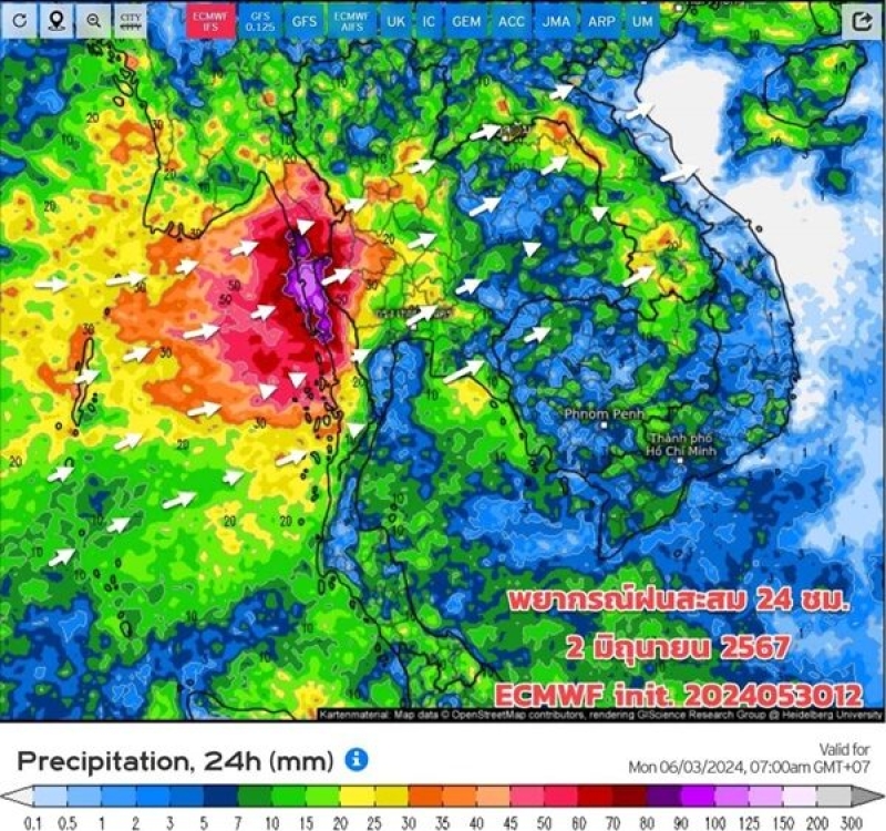 วันที่ 31 พ.ค.2567 กรมอุตุนิยมวิทยา อัพเดตผลการพยากรณ์ฝนสะสมรายวัน (ทุกๆ 24 ชม.:(นับตั้งแต่เวลา 07.00 น. ถึงเวลา 07.00 น.วันรุ่งขึ้น) และลมที่ระดับ 925hPa (750 ม.)10 วันล่วงหน้า ระหว่าง 31 พ.ค.-9 มิ.ย.67 init. 2024053012 จากศูนย์พยากรณ์อากาศระยะกลางยุโรป (ECMWF) (วิเคราะห์ตามผลของแบบจำลองฯ)