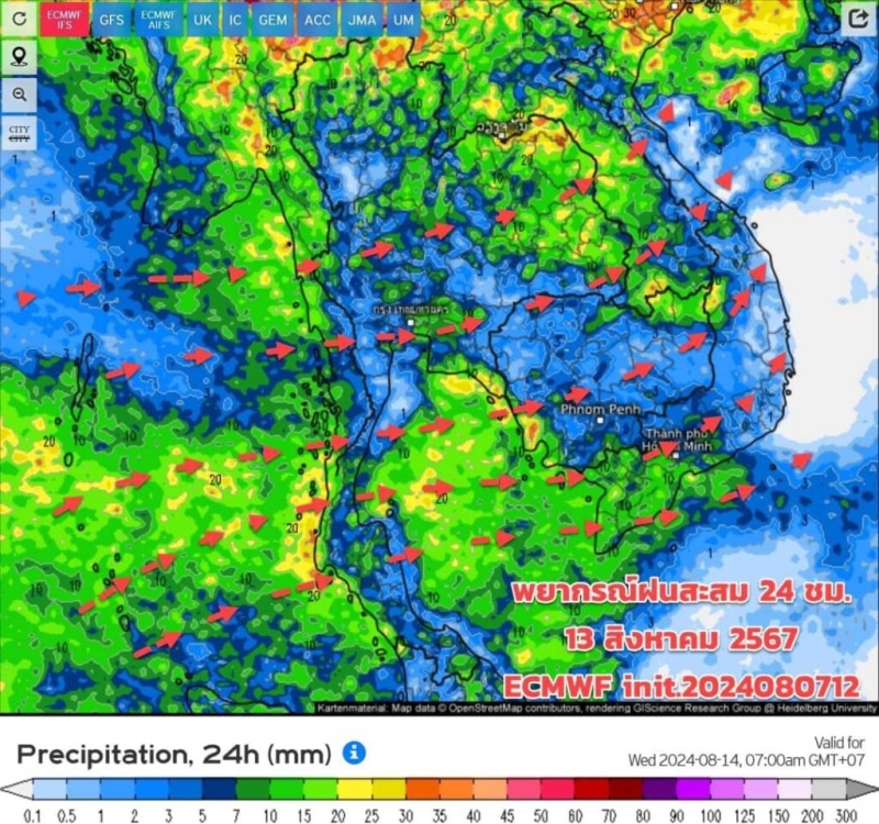 ส่วนในช่วงวันที่ 11-14 ส.ค. 67 มรสุมตะวันตกเฉียงใต้ที่พัดปกคลุมทะเลอันดามัน ประเทศไทย และอ่าวไทยจะมีกำลังแรงขึ้นเป็นกำลังปานกลาง ประกอบกับมีร่องมรสุมกำลังปานกลางพาดผ่านตอนบนของภาคเหนือ และประเทศลาวตอนบน เข้าสู่หย่อมความกดอากาศต่ำบริเวณประเทศเวียดนามตอนบน