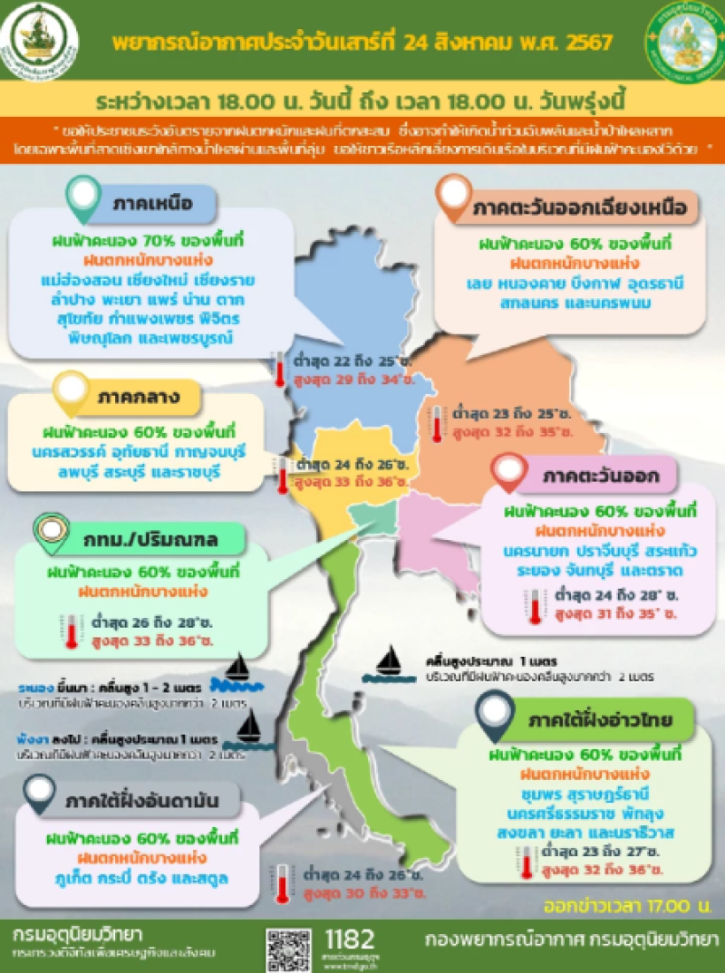 พยากรณ์อากาศวันนี้ 25 ส.ค. 2567 ร่องมรสุมพาดผ่านภาคเหนือตอนบนและประเทศลาวตอนบน เข้าสู่หย่อมความกดอากาศต่ำบริเวณประเทศเวียดนามตอนบน ประกอบกับมีแนวพัดสอบของลมตะวันออกเฉียงใต้และลมตะวันตกเฉียงใต้ในระดับบนปกคลุมภาคเหนือและภาคตะวันออกเฉียงเหนือ