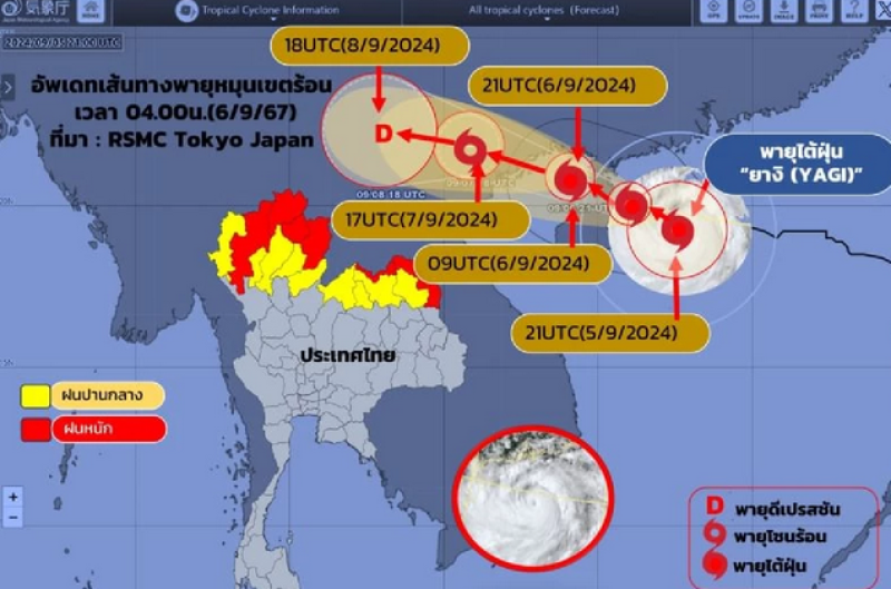 อัปเดต เส้นทาง พายุไต้ฝุ่น ยางิ จากศูนย์กรณ์เส้นทางพายุต่างๆ พายุไต้ฝุ่น "ยางิ(YAGI)" ยังมีศูนย์กลางอยู่บริเวณทะเลจีนใต้ตอนบน กำลังเคลื่อนตัวทางตะวันตก ค่อนไปทางเหนือเล็กน้อย คาดว่าจะเคลื่อนผ่านเกาะไหหลำ อ่าวตังเกี๋ย และขึ้นฝั่งประเทศเวียดนามตอนบนช่วงเวลา 13.00 น. วันพรุ่งนี้ (07/09/67) และจะอ่อนกำลังลงตามลำดับ