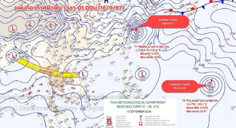 ส่วน พายุไต้ฝุ่น เบบินคา กำลังจะขึ้นฝั่งประเทศจีน และจะอ่อนกำลังลงตามลำดับ ไม่มีผลต่อประเทศไทย ฝนที่ตกในช่วงนี้มาจากอิทธิพลของร่องมรสุม และมรสุมกำลังค่อนข้างแรง