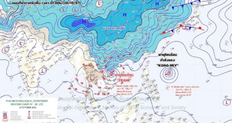 กรมอุตุนิยมวิทยา อัปเดตสถานการณ์ พายุ เวลา (28 ต.ค. 2567) พายุโซนร้อน "จ่ามี" (TRAMI) มีศูนย์กลางใกล้ชายฝั่งทางด้านตอนกลางของประเทศเวียดนาม กำลังเคลื่อนตัววกกลับไปในทะเลจีนใต้ และจะอ่อนกำลังลงตามลำดับ พายุจ่ามี จะไม่เคลื่อนเข้าสู่ประเทศไทย เนื่องจากยังมีมวลอากาศเย็นแผ่ลงมาปกคลุมทางด้านหน้าของ พายุ อาจจะส่งผลกระทบทำให้ประเทศไทยมีฝนบางแห่ง กับมีลมแรง โดยเฉพาะทางด้านตะวันออกของภาคอีสาน ตามแนวขอบของพายุ