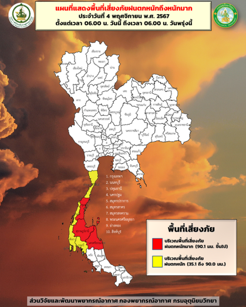 ประกาศ ณ วันที่ 4 พฤศจิกายน พ.ศ. 2567 เวลา 05.00 น. กรมอุตุนิยมวิทยาจะออกประกาศฉบับต่อไป ในวันที่ 4 พฤศจิกายน พ.ศ. 2567 เวลา 17.00 น.