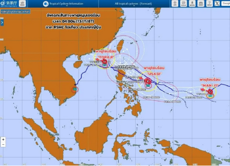ขณะที่ พายุโซนร้อน หม่านหยี่ (MAN-YI) เป็นพายุลูกที่ 24 MAN-YI หมายถึงชื่อช่องแคบ ปัจจุบันเป็นอ่างเก็บน้ำ ตั้งชื่อโดยเขตบริหารพิเศษฮ่องกง และ พายุโซนร้อน อูซางิ (USAGI) พายุลูกที่ 25 ซึ่งทั้ง 2 ลูก ยังไม่มีแนวโน้มจะเคลื่อนเข้าสู่ประเทศไทย มวลอากาศเย็นยังทำหน้าที่ดูดกลืนพายุไปเกือบทั้งหมด ไม่น่ากังวลเรื่องพายุที่จะส่งผลกระทบกับประเทศไทยในระยะ 10 วันข้างหน้านี้