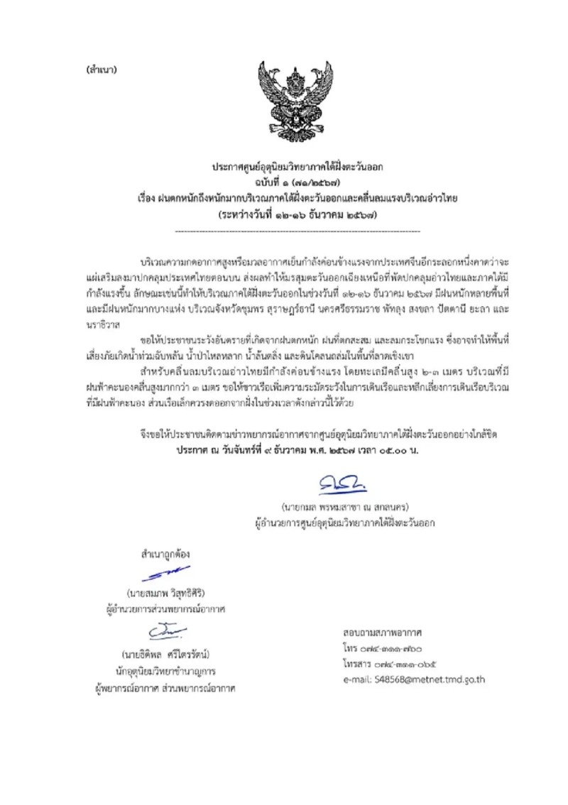 วันที่ 9 ธ.ค. 2567 ศูนย์อุตุนิยมวิทยาภาคใต้ฝั่งตะวันออก ได้พยากรณ์อากาศวันนี้ ประกาศเตือนฉบับที่ 1 ฝนตกหนักถึงหนักมากบริเวณภาคใต้ฝั่งตะวันออกและคลื่นลมแรงบริเวณอ่าวไทย (ระหว่างวันที่ 12-16 ธันวาคม 2567) โดยระบุว่า บริเวณความกดอากาศสูงหรือมวลอากาศเย็นกำลังค่อนข้างแรงจากประเทศจีนอีกระลอกหนึ่งคาดว่าจะแผ่เสริมลงมาปกคลุมประเทศไทยตอนบน ส่งผลทำให้มรสุมตะวันออกเฉียงเหนือที่พัดปกคลุมอ่าวไทยและภาคใต้มีกำลังแรงขึ้น
