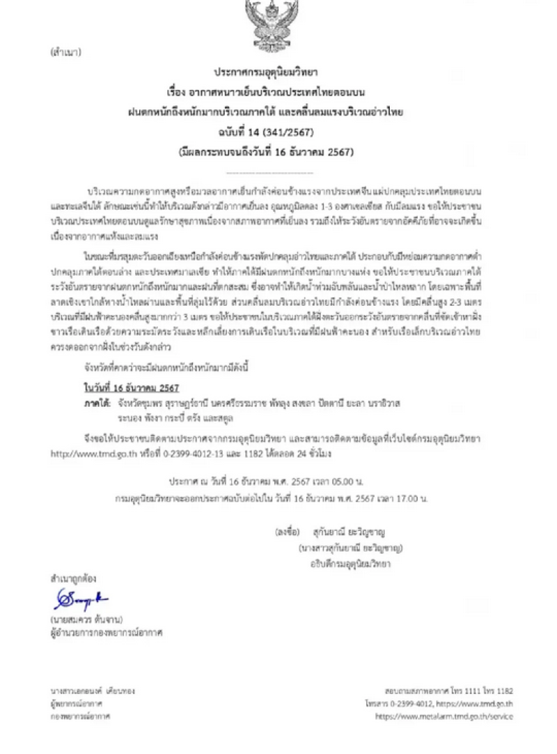 กรมอุตุนิยมวิทยาจะออกประกาศฉบับต่อไปใน วันที่ 16 ธันวาคม พ.ศ. 2567 เวลา 17.00 น.
