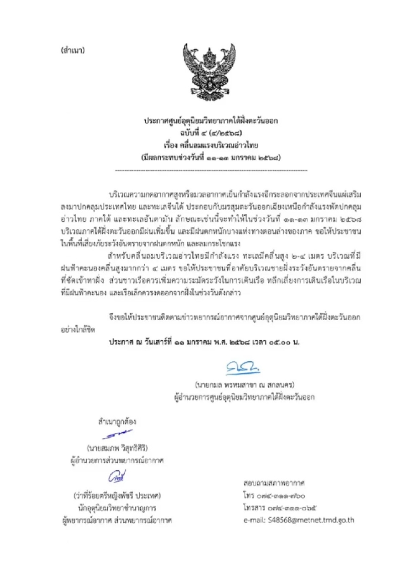 พยากรณ์อากาศวันนี้ ประกาศศูนย์อุตุนิยมวิทยาภาคใต้ฝั่งตะวันออก ฉบับที่ 4 (4/2568) เรื่อง คลื่นลมแรงบริเวณอ่าวไทย (มีผลกระทบช่วงวันที่ 11-13 มกราคม 2568) บริเวณความกดอากาศสูงหรือมวลอากาศเย็นกำลังแรงอีกระลอกจากประเทศจีนแผ่เสริมลงมาปกคลุมประเทศไทย และทะเลจีนใต้ ประกอบกับมรสุมตะวันออกเฉียงเหนือกำลังแรงพัดปกลุมอ่าวไทย ภาคใต้ และทะเลอันดามัน