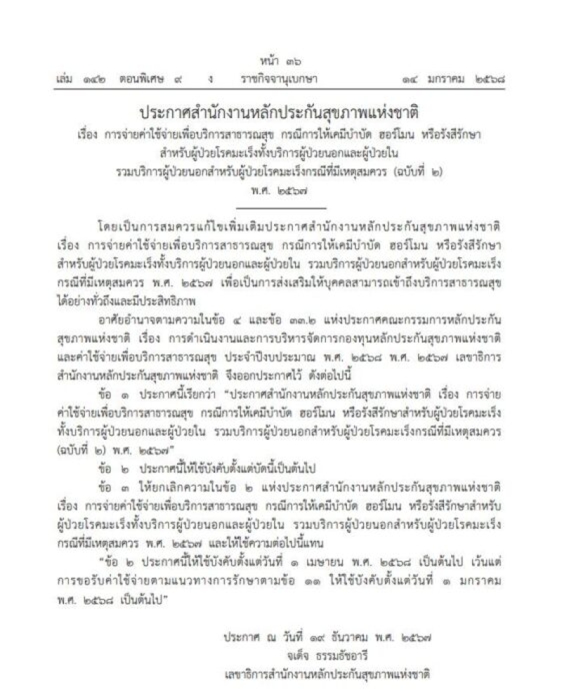 วันที่ 15 ม.ค.68 ผู้สื่อข่าวรายงานว่า ราชกิจจานุเบกษา เผยแพร่ ประกาศสำนักงานหลักประกันสุขภาพแห่งชาติ เรื่อง การจ่ายค่าใช้จ่ายเพื่อบริการสาธารณสุข กรณีการให้เคมีบำบัด ฮอร์โมน หรือ รังสีรักษา สำหรับผู้ป่วยโรคมะเร็งทั้งบริการผู้ป่วยนอกและผู้ป่วยใน รวมบริการผู้ป่วยนอกสำหรับผู้ป่วยโรคมะเร็งกรณีที่มีเหตุสมควร (ฉบับที่ 2)