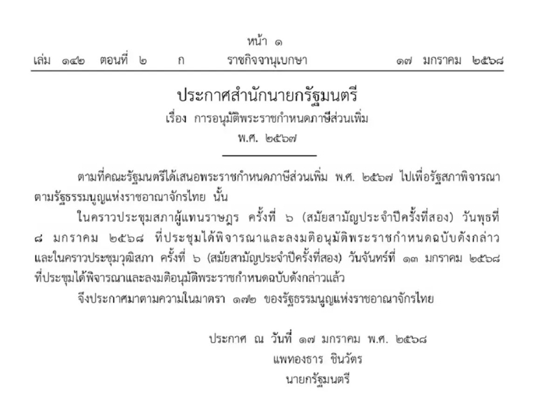 วันที่ ๑๗ มกราคม ๒๕๖๘ เว็บไซต์ราชกิจจานุเบกษาเผยแพร่ประกาศสำนักนายกรัฐมนตรี เรื่อง การอนุมัติพระราชกำหนดภาษีส่วนเพิ่ม พ.ศ. ๒๕๖๗ (พ.ร.ก.ภาษีส่วนเพิ่ม พ.ศ. ๒๕๖๗) โดยมีรายละเอียดดังต่อไปนี้