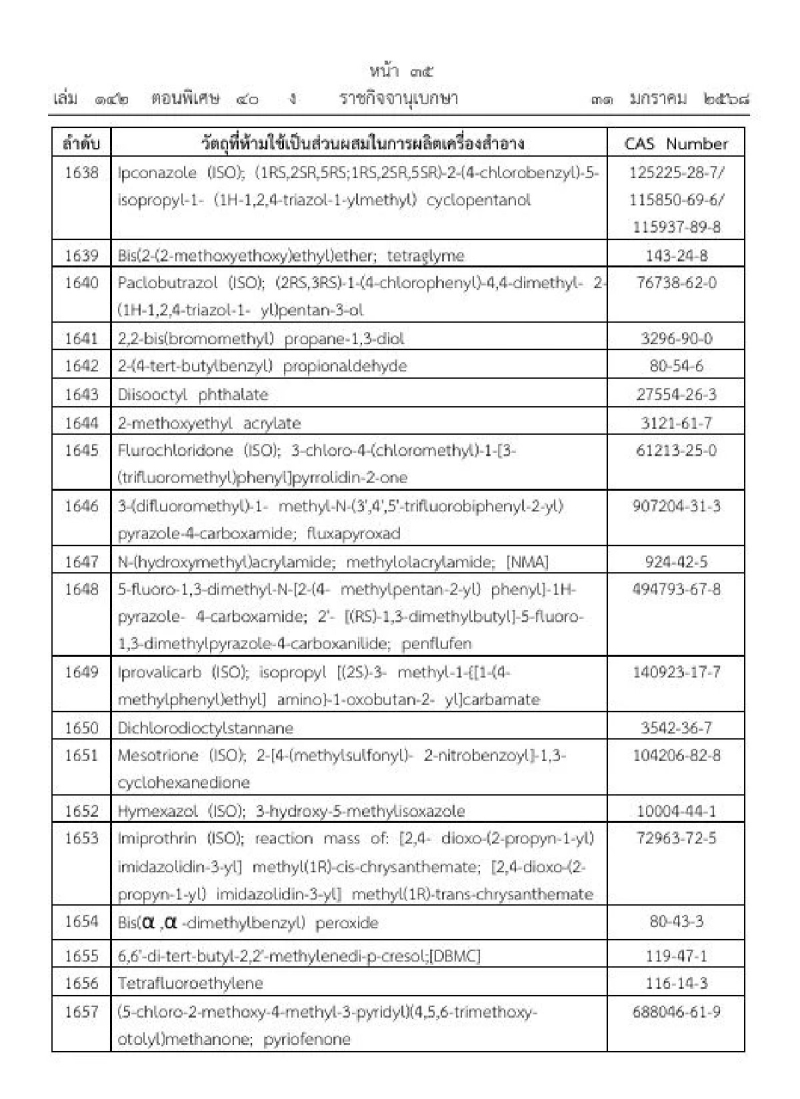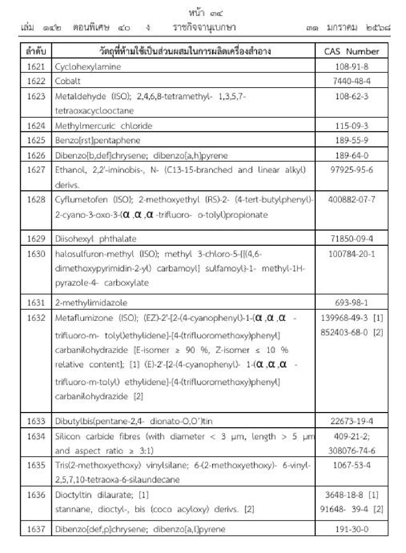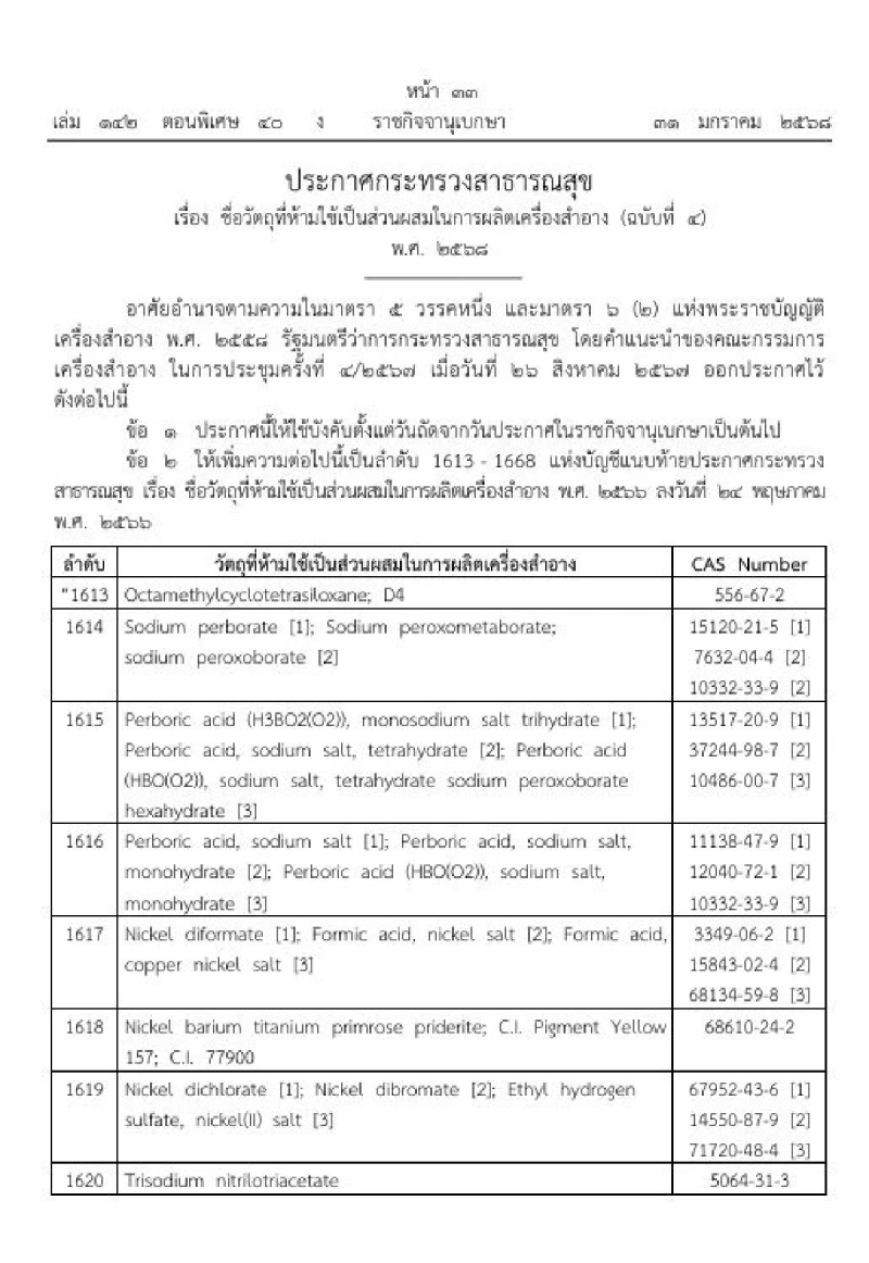 กระทรวงสาธารณสุขออกประกาศใหม่ เรื่อง "ชื่อวัตถุที่ห้ามใช้เป็นส่วนผสมในการผลิตเครื่องสำอาง (ฉบับที่ 4)" โดยอาศัยอำนาจตามพระราชบัญญัติเครื่องสำอาง พ.ศ. 2558 เพื่อคุ้มครองความปลอดภัยของผู้บริโภค