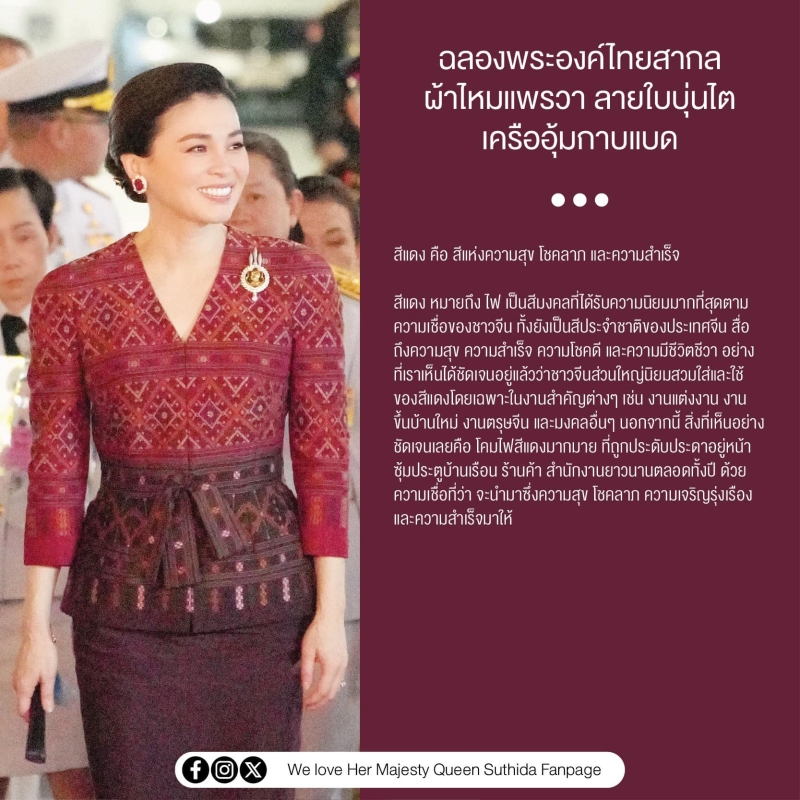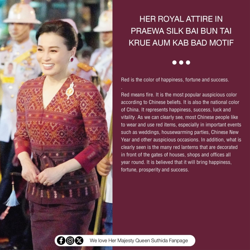 สมเด็จพระนางเจ้าฯ พระบรมราชินี ทรงฉลองพระองค์ไทยสากล ผ้าไหมแพรวา ลายใบบุ่นไตเครืออุ้มกาบแบด สีแดง คือ สีแห่งความสุข โชคลาภ และความสำเร็จ สีแดง หมายถึง ไฟ เป็นสีมงคลที่ได้รับความนิยมมากที่สุดตามความเชื่อของชาวจีน