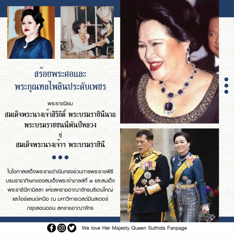 สร้อยพระศอและพระกุณฑลไพลินประดับเพชร พระราชนิยม สมเด็จพระนางเจ้าสิริกิติ์ พระบรมราชินีนาถ พระบรมราชชนนีพันปีหลวง สู่ สมเด็จพระนางเจ้าฯ พระบรมราชินี