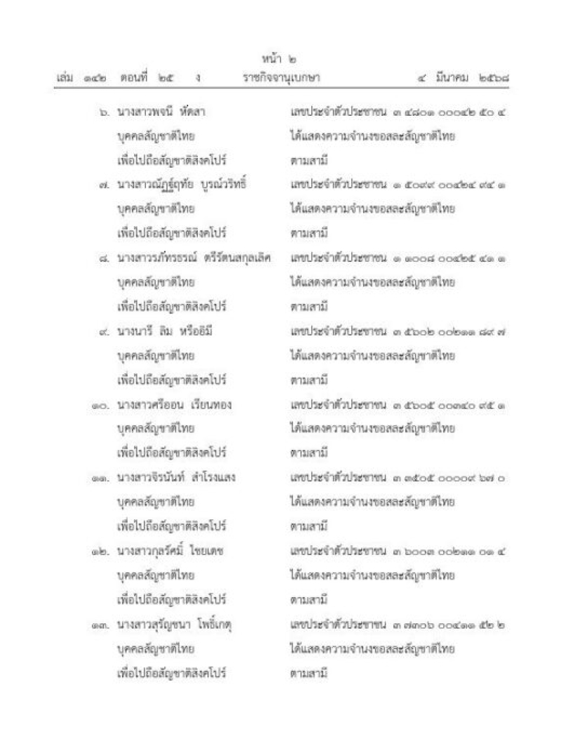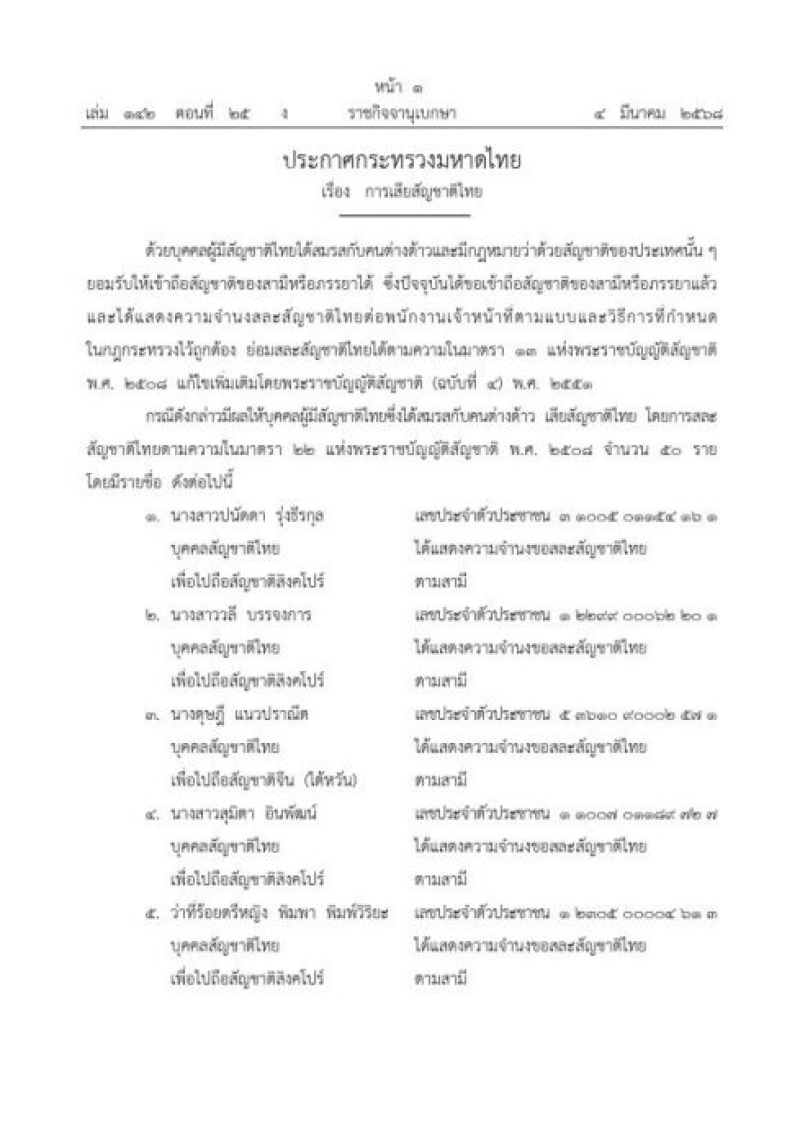 เมื่อวันที่ 4 มี.ค.68 เว็บไซต์ ราชกิจจานุเบกษา เผยแพร่ ประกาศกระทรวงมหาดไทย เรื่อง การเสียสัญชาติไทย จำนวน 50 ราย ระบุว่า ด้วยบุคคลผู้มีสัญชาติไทยได้สมรสกับคนต่างด้าวและมีกฎหมายว่าด้วยสัญชาติของประเทศนั้นๆ ยอมรับให้เข้าถือสัญชาติของสามีหรือภรรยาได้