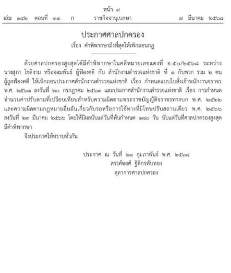 ด้วยศาลปกครองสูงสุดได้มีคําพิพากษาในคดีหมายเลขแดงที่ อ.๕๐/๒๕๖๘ ระหว่าง นางสุภา โชติงาน หรือจอมพันธ์ ผู้ฟ้องคดี กับ สํานักงานตํารวจแห่งชาติ ที่ ๑ กับพวก รวม ๒ คน ผู้ถูกฟ้องคดี ให้เพิกถอนประกาศสํานักงานตํารวจแห่งชาติ เรื่อง กําหนดแบบใบสั่งเจ้าพนักงานจราจร พ.ศ. ๒๕๖๓ ลงวันที่ ๒๐ กรกฎาคม ๒๕๖๓ และประกาศสํานักงานตํารวจแห่งชาติ