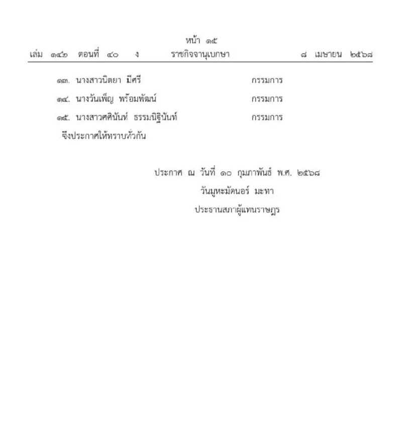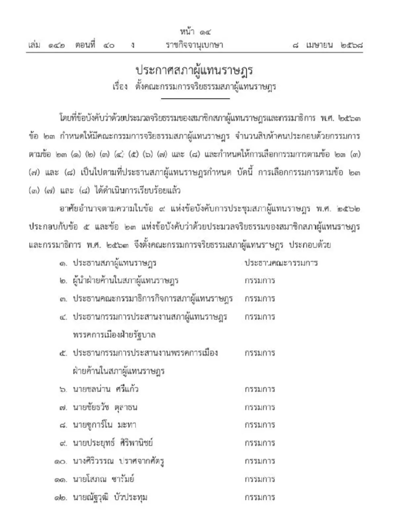 เว็บไซต์ราชกิจจานุเบกษา ๘ เมษายน ๒๕๖๘ เผยแพร่ประกาศสภาผู้แทนราษฎร เรื่อง ตั้งคณะกรรมการจริยธรรมสภาผู้แทนราษฎร โดยที่ข้อบังคับว่าด้วยประมวลจริยธรรมของสมาชิกสภาผู้แทนราษฎรและกรรมาธิการ พ.ศ. ๒๕๖๓ กำหนดให้มีคณะกรรมการจริยธรรมสภาผู้แทนราษฎร จำนวน ๑๕ คนประกอบด้วยกรรมการตามข้อ ๒๓ (๑) (๒) (๓) (๔) (๕) (๖) (๗) และ (๘) และกำหนดให้มีการเลือกกรรมการตามข้อ ๒๓ (๙) (๑๐) และ (๑๑) เป็นไปตามที่ประธานสภาผู้แทนราษฎรกำหนด บัดนี้ การเลือกกรรมการตามข้อ ๒๓ (๙) (๑๐) และ (๑๑) ได้ดำเนินการเรียบร้อยแล้ว