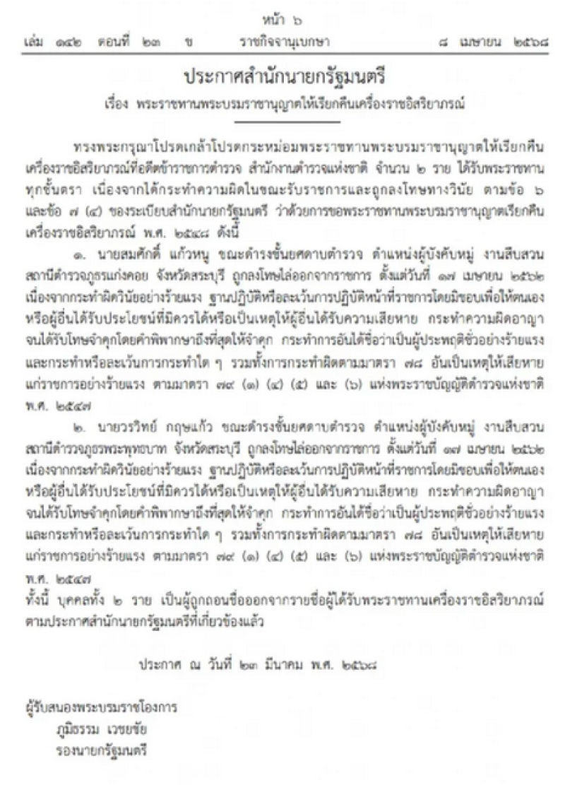 ราชกิจจานุเบกษาเผยแพร่ ประกาศสำนักนายกรัฐมนตรี เรื่อง พระราชทานพระบรมราชานุญาตให้เรียกคืนเครื่องราชอิสริยาภรณ์ที่อดีตข้าราชการตำรวจ สำนักงานงานตำรวจแห่งชาติ จำนวน 2 ราย ได้รับพระราชทานทุกขั้นตรา เนื่องจากได้กระทำความผิดในขณะรับราชการและถูกลงโทษทางวินัย ตามข้อ 6 และข้อ 7 (4) ของระเบียบสำนักนายกรัฐมนตรี ว่าด้วยการขอพระราชทานพระบรมราชานุญาตเรียกคืนเครื่องราชอิสริยาภรณ์ พ.ศ. 2548 ดังนี้