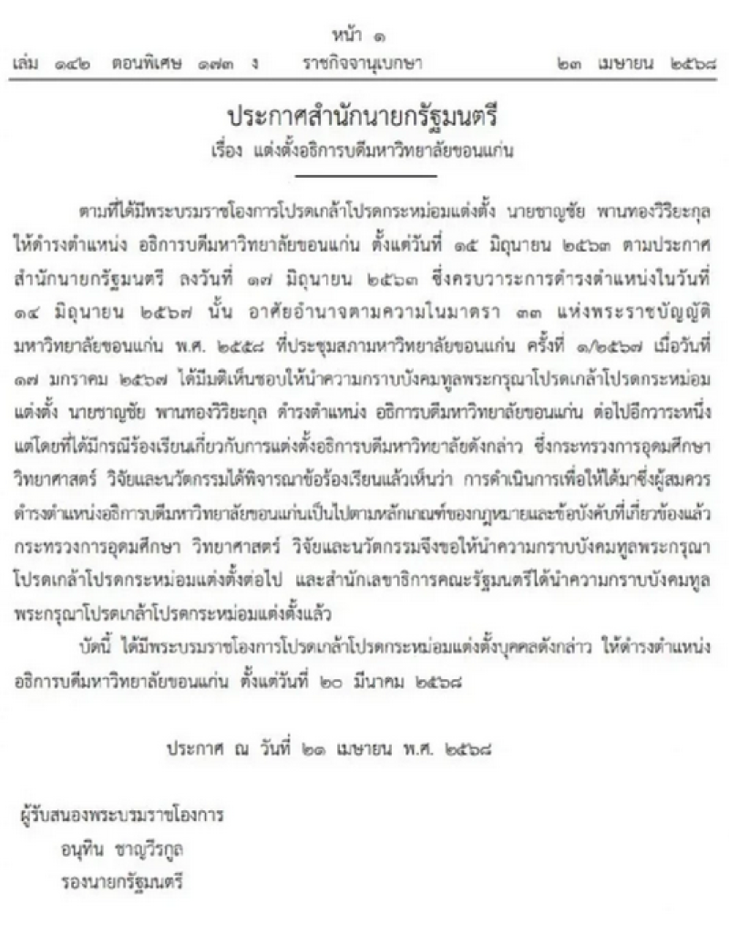 บัดนี้ ได้มีพระบรมราชโองการโปรดเกล้าโปรดกระหม่อมแต่งตั้งบุคคลดังกล่าว ให้ดำรงตำแหน่ง อธิการบดีมหาวิทยาลัยขอนแก่น ตั้งแต่วันที่ 20 มีนาคม 2568