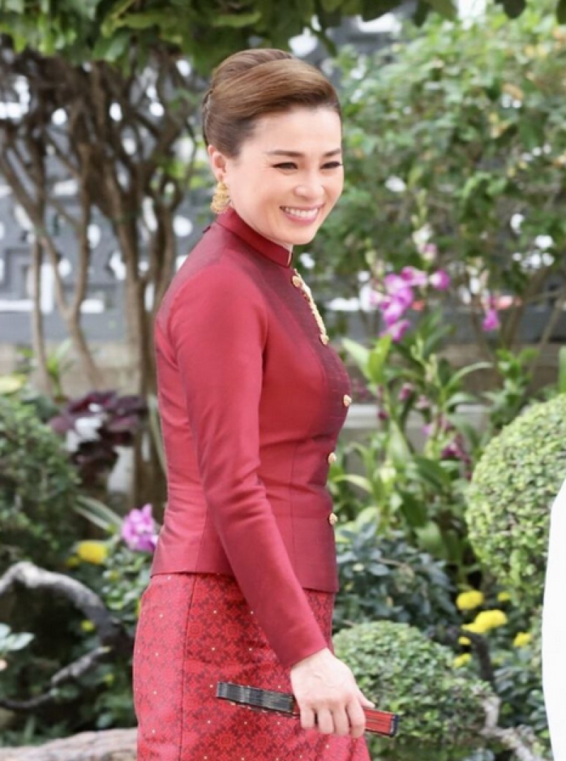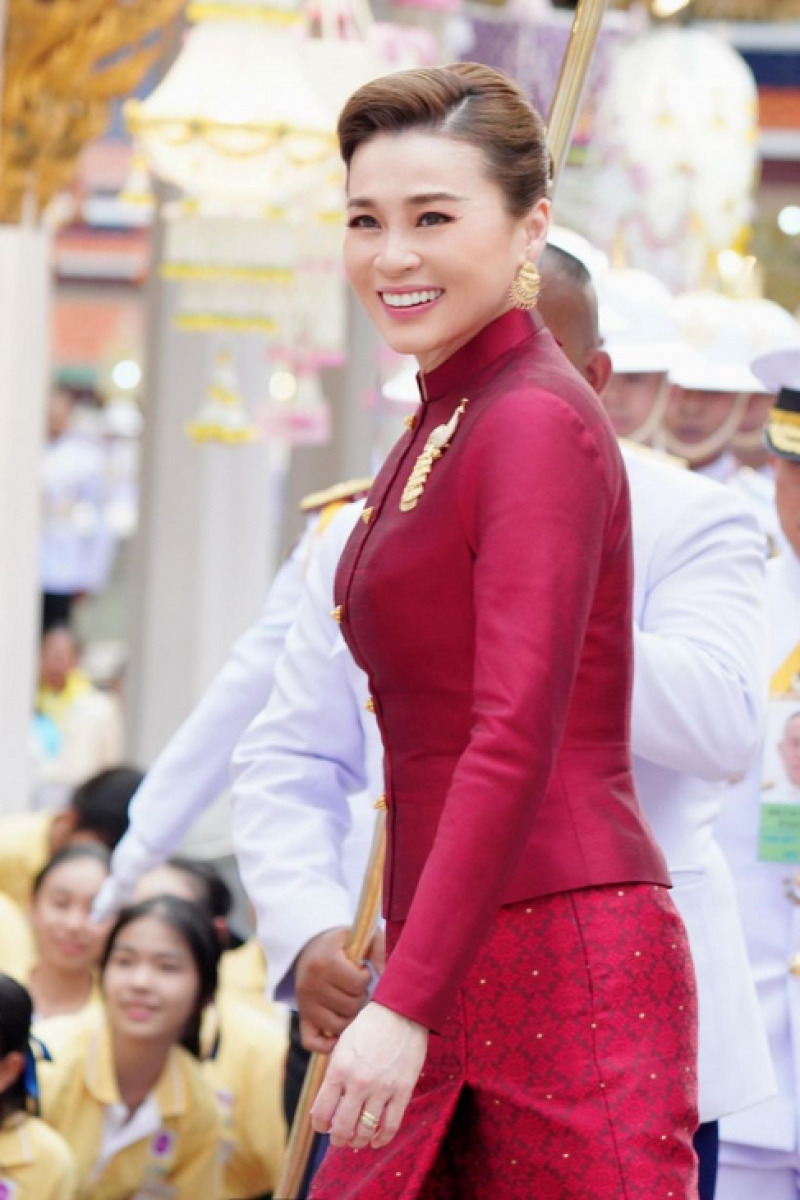 พระราชินี ฉลองพระองค์ไทยอมรินทร์ ผ้าไหมพื้นเรียบ พระภูษาผ้าไหมยกดอก ลายสุริยฉาย เชิงทอง ลายสุริยะฉาย เป็นการผูกลายระหว่างลายพิกุล กับ ลายประจำยาม ลวดลายที่มีรูปร่างสี่เหลี่ยมจัตุรัสตะแคง มีลักษณะคล้ายดอกไม้ โดยดัดแปลงมาจากดอกไม้ชนิดหนึ่งที่เรียกว่า "ดอกสี่ทิศ" สุริยฉาย แปลว่า ความหมาย หมายถึง ดวงอาทิตย์ฉายแสง