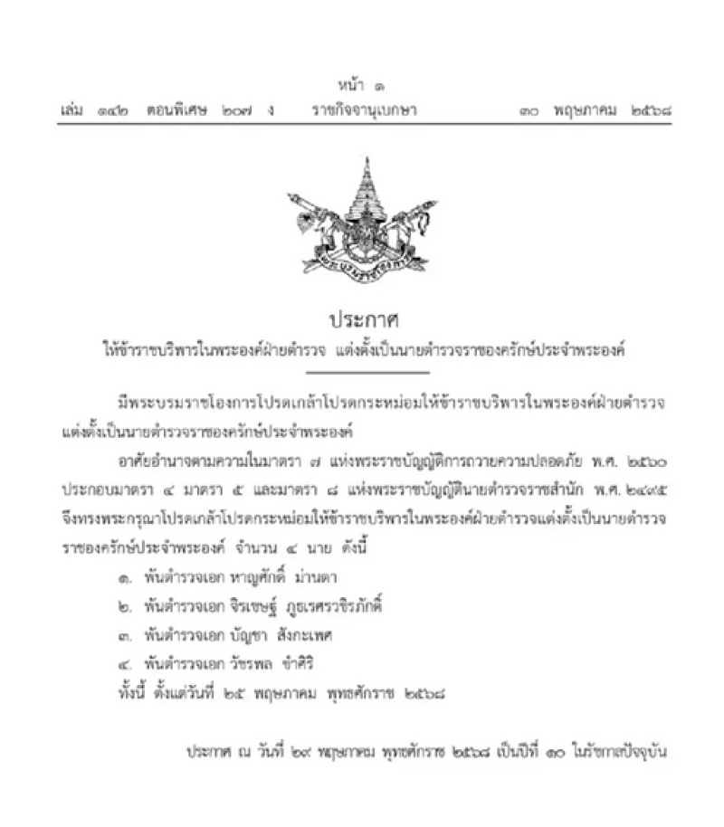 อาศัยอำนาจตามความในมาตรา 7 แห่ง พ.ร.บ.การถวายความปลอดภัย พ.ศ.2560 ประกอบมาตรา 4 มาตรา 5 และมาตรา 8 แห่ง พ.ร.บ.นายตำรวจราชสำนัก พ.ศ.2495 จึงทรงพระกรุณาโปรดเกล้าฯ ให้ข้าราชบริพารในพระองค์ฝ่ายตำรวจ แต่งตั้งเป็นนายตำรวจราชองครักษ์ประจำพระองค์ จำนวน 4 นาย ดังนี้
