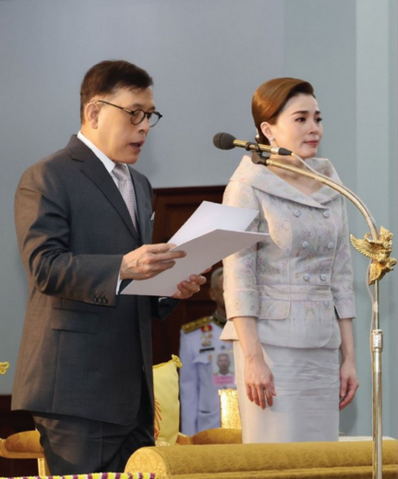 ฉลองพระองค์ไทยสากลผ้าไหมแพรวา ลายเกาะ ลายดอกบัว ดอกหางปลาวาแปลง และดอกส้มป่อย เทคนิคการทอผ้าไหมแพรวา การทอผ้าไหมแพรวาจะมีการจกและการเก็บลายไปตลอดการทอ โดยกรรมวิธีการทำให้เกิดลวดลายจากตะกอหรือเขาลาย แล้วสอดเส้นด้ายพุ่งพิเศษไปตลอดความยาวหน้าผ้า และการจกโดยใช้นิ้วก้อยในการล้วงเกาะยกเส้นยืนและสอดเส้นไหมสีต่างๆเป็นช่วงๆตามลายที่กำหนด ครั้งละ ๒ เที่ยวเพื่อให้ลายนูนเด่นจนสุดขอบผ้า เกิดเป็นลวดลายที่สวยงามปรากฏบริเวณด้านล่างของกี่