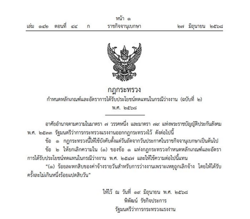 ราชกิจจาฯ ประกาศแล้ว กฎกระทรวง พ.ร.บ.ประกันสังคม กำหนดอัตราการได้รับประโยชน์ทดแทนในกรณีว่างงาน 2568 จาก 50% เป็น 60% ของค่าจ้างรายวัน
