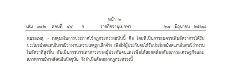 เพื่อให้ผู้ประกันตนที่ว่างงานจากการถูกเลิกจ้างได้รับประโยชน์ทดแทนเพียงพอต่อการดำรงชีวิตจากสภาพเศรษฐกิจในปัจจุบัน โดยในการประชุมคณะรัฐมนตรี เมื่อวันที่ 6 พ.ค. 68 ได้มีมติเห็นชอบ