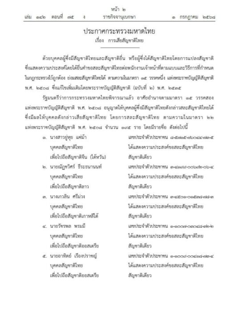 วันที่ 2 ก.ค.68 เว็บไซต์ราชกิจจานุเบกษา เผยแพร่ประกาศกระทรวงมหาดไทย เรื่อง การเสียสัญชาติไทย ระบุว่า ด้วยบุคคลผู้ซึ่งมีสัญชาติไทยและสัญชาติอื่น หรือผู้ซึ่งได้สัญชาติไทยโดยการแปลงสัญชาติ ซึ่งแสดงความประสงค์