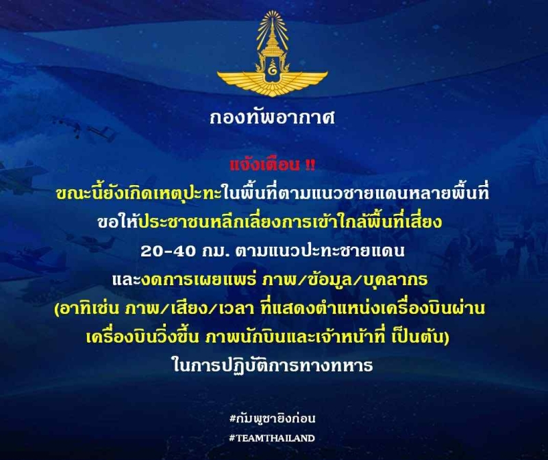 ซึ่ง สถานการณ์ตามแนวชายแดนยังคงตึงเครียด กองทัพอากาศ ได้ประกาศเตือนให้ประชาชนหลีกเลี่ยงการเข้าใกล้พื้นที่เสี่ยง 20-40 กิโลเมตรจากแนวปะทะ เนื่องจาก มีเหตุปะทะเกิดขึ้นในหลายพื้นที่ อาจส่งผลต่อความปลอดภัยของประชาชนในบริเวณดังกล่าว
