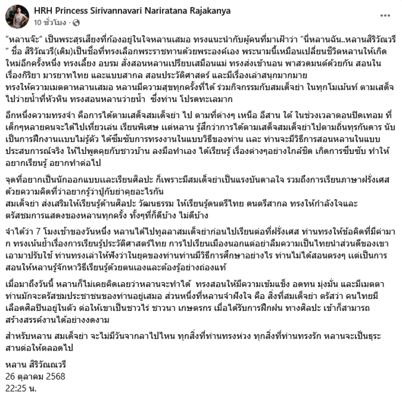 เมื่อมาถึงวันนี้ หลานก็ไม่เคยคิดเลยว่าหลานจะทำได้ ทรงสอนให้มีความเข้มแข็ง อดทน มุ่งมั่น และมีเมตตา ท่านมักจะตรัสชมประชาชนของท่านอยู่เสมอ ส่วนหนึ่งที่หลานจำฝังใจ คือ สิ่งที่สมเด็จย่า ตรัสว่า คนไทยมีเลือดศิลปินอยู่ในตัว ต่อให้เขาเป็นชาวไร่ ชาวนา เกษตรกร เมื่อได้รับการฝึกฝน ทางศิลปะ เข้าก็สามารถสร้างสรรค์งานได้อย่างงดงาม สำหรับหลาน สมเด็จย่า จะไม่มีวันจากลาไปไหน ทุกสิ่งที่ท่านทรงห่วง ทุกสิ่งที่ท่านทรงรัก หลานจะเป็นธุระสานต่อให้ตลอดไป หลาน สิริวัณณวรี 26 ตุลาคม 2568 22:25 น.