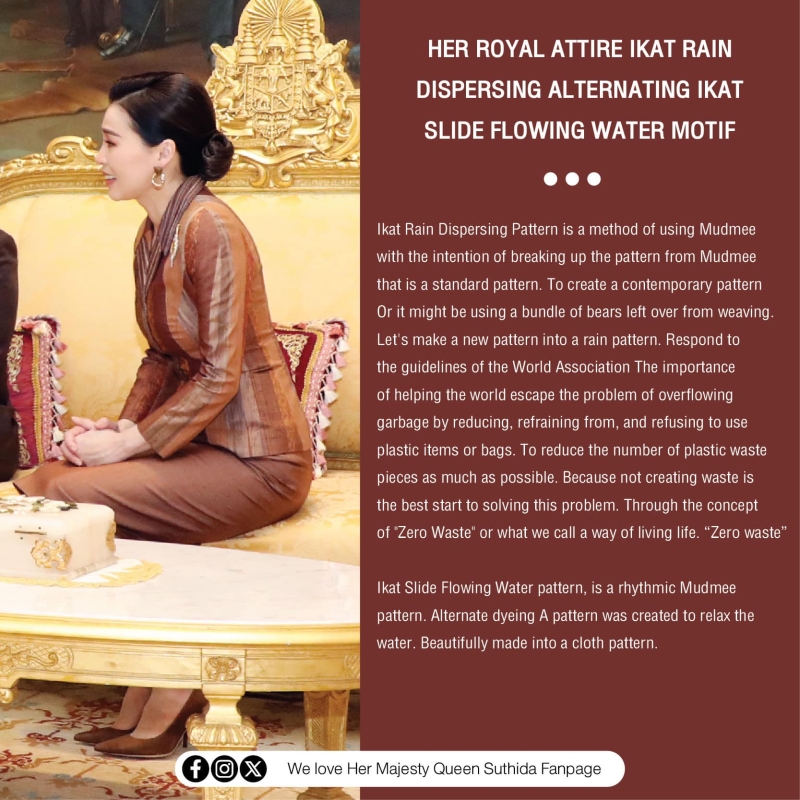 ในการนี้ สมเด็จพระนางเจ้าฯ พระบรมราชินีทรงฉลองพระองค์ ผ้าไหมมัดหมี่สลายลาย ลายสายฝน สลับ มัดหมี่สไลด์ลายน้ำไหล