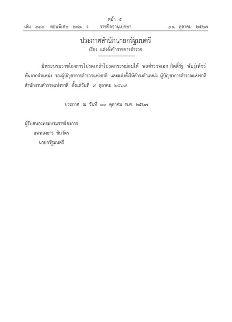 และแต่งตั้งให้ดำรงตำแหน่ง ผู้บัญชาการตำรวจแห่งชาติ สำนักงานตำรวจแห่งชาติ ตั้งแต่วันที่ 9 ตุลาคม 2567 ประกาศ ณ วันที่ 11 ตุลาคม พ.ศ.2567 ผู้รับสนองพระบรมราชโองการแพทองธาร ชินวัตร นายกรัฐมนตรี