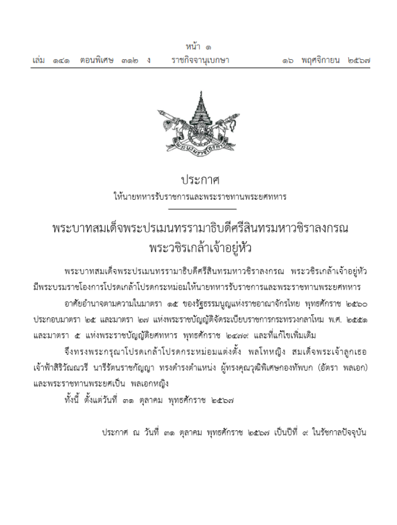 วันที่ 16 พฤศจิกายน 2567 เว็บไซต์ราชกิจจานุเบกษา เผยแพร่ประกาศให้นายทหารรับราชการและพระราชทานพระยศทหาร ความว่า