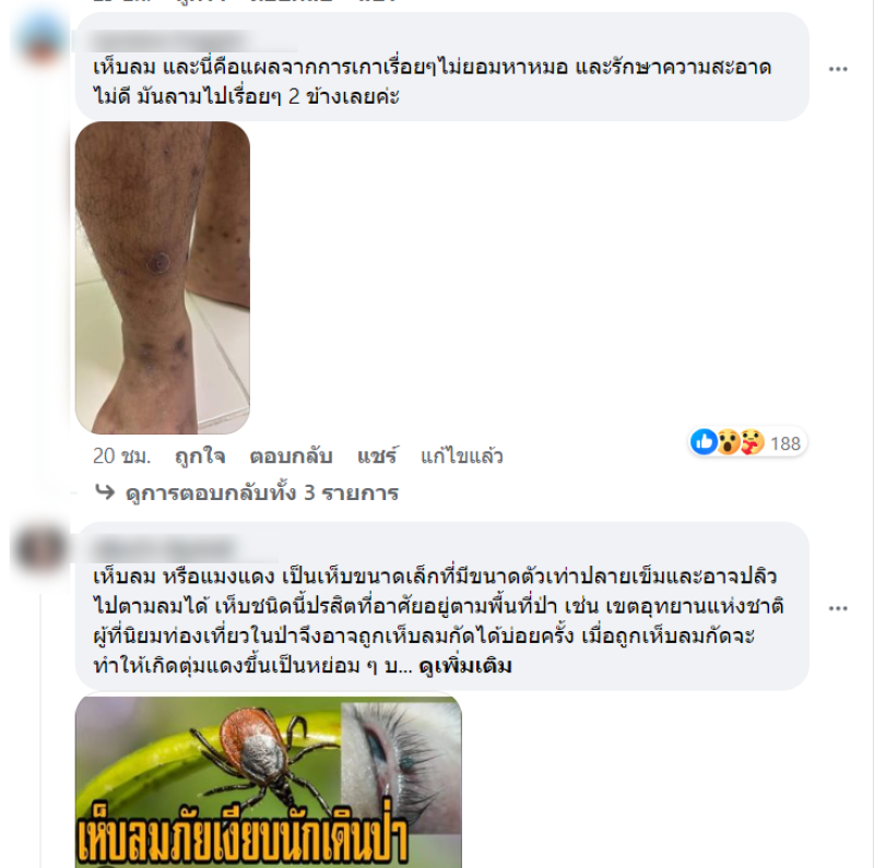 ทางสมาชิกเพจ ก็ได้เข้ามาคอมเมนต์และบอกตรงกันว่าแมลงตัวร้ายคือ เห็บลม หรือที่บางคนเรียกว่า แมงแดง เป็นเห็บขนาดเล็กเท่าปลายเข็ม โดยทั่วไปถือเป็นปรสิตที่อาศัยอยู่ตามพื้นที่ป่า มักพบได้ในฤดูแล้ง และเนื่องจากเห็บลมมีขนาดตัวที่เล็กมาก และสามารถปลิวไปตามลมได้ ดังนั้น เมื่อถูกกัดจะเกาะติดอยู่ที่ผิวหนังโดยเราไม่รู้ตัว บริเวณที่ถูกกัดจะเป็นผื่นแดงเจ็บคัน บางคนที่มีอาการแพ้อาจเป็นไข้ได้