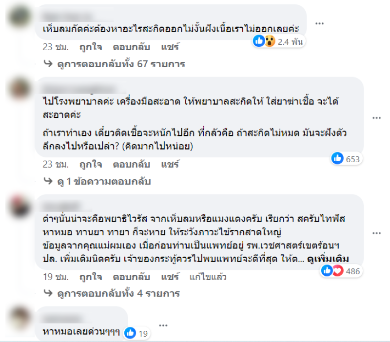 และหลายคนก็แนะนำให้ไปหาหมดโดยเร็ว เพราะจำเป็นต้องสะกิดออกโดยเครื่องมือสะอาด ไม่เช่นนั้นจะฝังเนื้อเอาไม่ออก ซึ่งหากสะกิดออกเองอาจติดเชื้อหรือเอาออกไม่หมดได้ และก็มีบางคนมาฝากอุทาหรณ์ที่ตัวเองก็เคยเป็นเช่นกัน