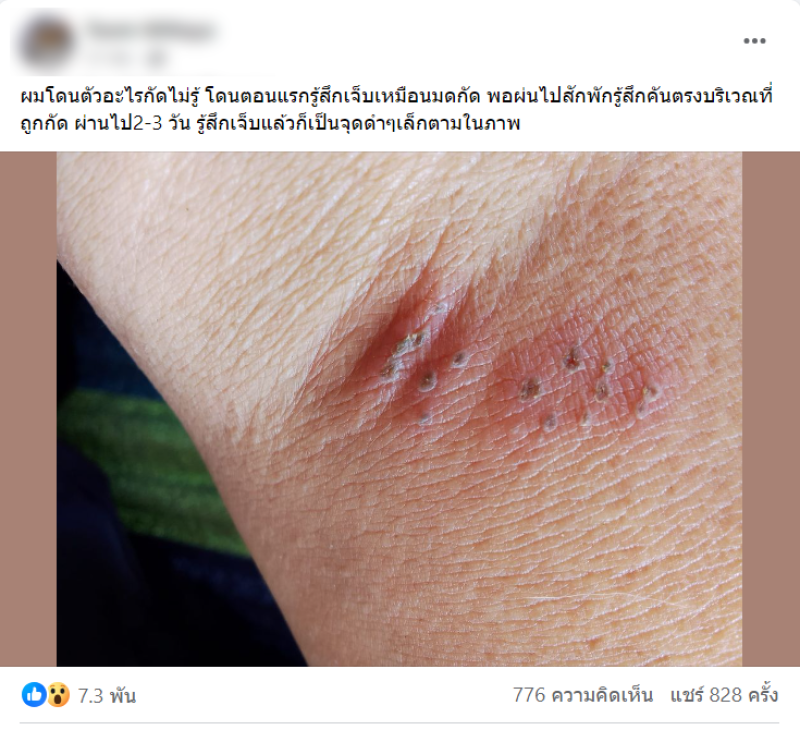 เมื่อวันที่ 20 ก.พ. 67 ที่ผ่านมา ได้มีผู้ใช้facebook รายหนึ่ง ได้โพสต์ลงกลุ่ม นี่ตัวอะไร โดยได้ระบุข้อความว่า ผมโดนตัวอะไรกัดไม่รู้ โดนตอนแรกรู้สึกเจ็บเหมือนมดกัด พอผ่นไปสักพักรู้สึกคันตรงบริเวณที่ถูกกัด ผ่านไป2-3 วัน รู้สึกเจ็บแล้วก็เป็นจุดดำๆเล็กตามในภาพ ซึ่งในภาพจะเห็นว่า มีจุดๆสีดำและแดงๆหลายจุด เกิดชึ้นบนผิวหนัง ทำเอาเจ้าตัวงงมาก