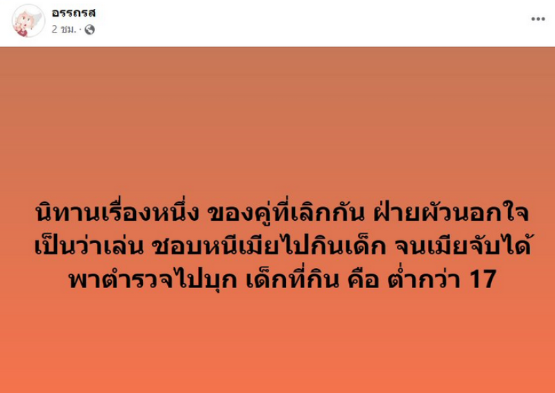 วันนี้ 21 ก.พ. 2567 เพจ อรรถรส โพสต์ว่า นิทานเรื่องหนึ่ง ของคู่ที่เลิกกัน ฝ่ายผัวนอกใจเป็นว่าเล่น ชอบหนีเมียไปกินเด็ก จนเมียจับได้พาตำรวจไปบุก เด็กที่กิน คือ ต่ำกว่า 17 นอกจากนี้ยังโพสต์อีกว่า หูยยยยยยยย เรื่องมันแซ่บบบบบบบบบบ ไม่พอตอนนี้พยายามหาคนมาช่วยปลดหนี้บ้านอีกด้วย คือ ใครหลงคารม เตรียมตัว