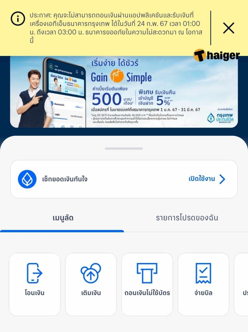คุณจะไม่สามารถถอนเงินผ่านแอปพลิเคชั่นและรับเงินที่เครื่องเอทีเอ็มธนาคารกรุงเทพ ได้ในวันที่ 24 ก.พ. 67เวลา 01.00 น. ถึงเวลา 03.00 น. ธนาคารขออภัยในความไม่สะดวกมา ณ โอกาสนี้