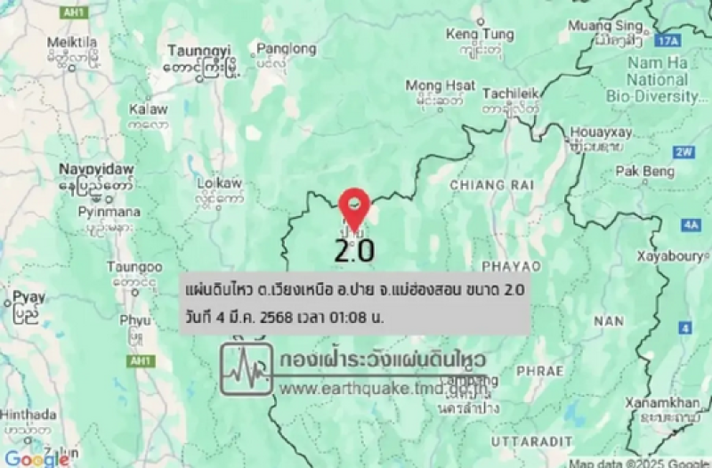 รายงานเหตุการณ์วันนี้ ไทยแผ่นดินไหว สะเทือน 3 จังหวัดภาคเหนือ ระทึก กองเฝ้าระวังแผ่นดินไหว กรมอุตุนิยมวิทยา รายงานเกิดเหตุ "แผ่นดินไหวประเทศไทย" วันนี้ 4 มีนาคม 2568 "แผ่นดินไหวแม่ฮ่องสอน - แผ่นดินไหวสุโขทัย - แผ่นดินไหวเชียงราย" โดยมีรายละเอียดไทม์ไลน์แผ่นดินไหวดังนี้