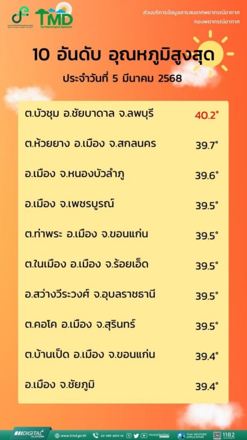 วันที่ 5 มีนาคม กรมอุตุนิยมวิทยา เผยแพร่ 10 อันดับอุณหภูมิสูงสุด ประจำวันที่ 5 มีนาคม 2568