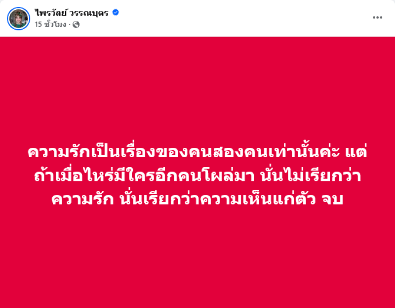 ล่าสุดทางด้าน แพรรี่ ไพรวัลย์ ได้ออกมาโพสต์ให้ข้อคิดถึงประเด็นดังกล่าวผ่านทางเฟซบุ๊ค ไพรวัลย์ วรรณบุตร พร้อมเขียนข้อความว่า ความรักเป็นเรื่องของคนสองคนเท่านั้นค่ะ แต่ถ้าเมื่อไหร่มีใครอีกคนโผล่มา นั่นไม่เรียกว่าความรัก นั่นเรียกว่าความเห็นแก่ตัว จบ