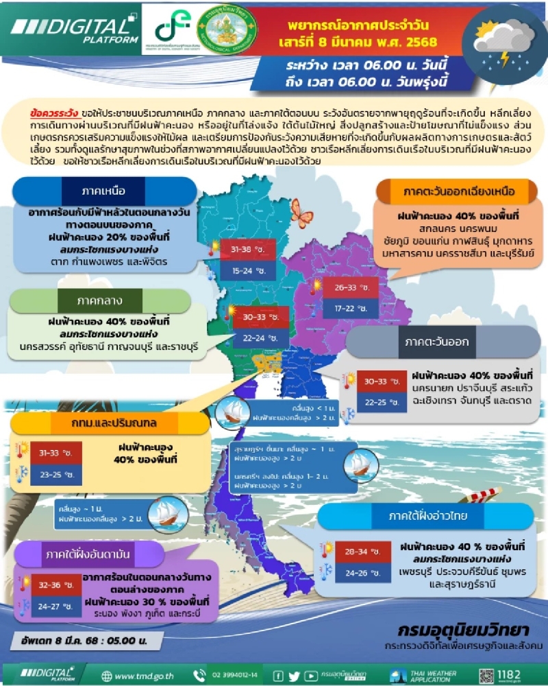 กรมอุตุนิยมวิทยา พยากรณ์อากาศวันที่ 08 มีนาคม 2568 24 ชั่วโมงข้างหน้า บริเวณภาคเหนือ ภาคกลาง และภาคใต้ตอนบนยังคงมีพายุฤดูร้อนเกิดขึ้น โดยมีลักษณะของฝนฟ้าคะนอง กับมีลมกระโชกแรงบางแห่ง รวมถึงอาจมีฟ้าผ่าเกิดขึ้นได้บางพื้นที่ หลังจากนั้นอากาศจะคลายความร้อนลง ขอให้ประชาชนในบริเวณดังกล่าวระวังอันตรายจากพายุฤดูร้อนที่จะเกิดขึ้น โดยหลีกเลี่ยงการเดินทางผ่านบริเวณที่มีฝนฟ้าคะนอง หรืออยู่ในที่โล่งแจ้ง ใต้ต้นไม้ใหญ่ สิ่งปลูกสร้างและป้ายโฆษณาที่ไม่แข็งแรง