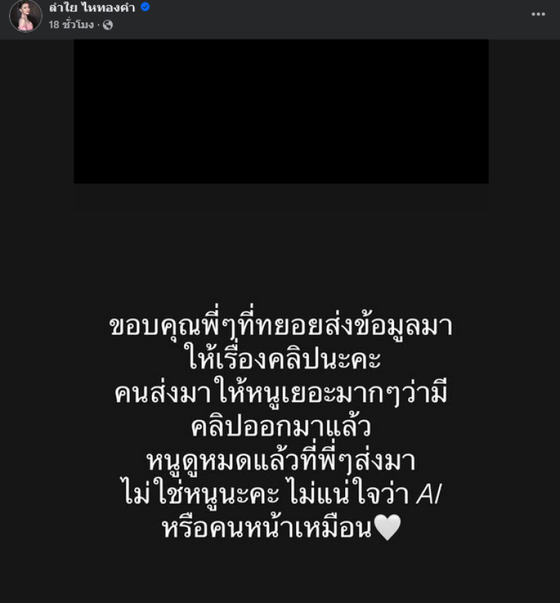 จากกรณีที่ก่อนหน้านี้ทางด้านนักร้องสาว ลำไย ไหทองคำ ได้ออกมาโพสต์ชี้แจงถึงเรื่องราวประเด็นคลิปหลุด ผ่านทางเฟซบุ๊ค ลำใย ไหทองคำ โดยระบุว่า ขอบคุณพี่ๆที่ทยอยส่งข้อมูลมาให้เรื่องคลิปนะคะ คนส่งมาให้หนูเยอะมากๆว่ามีคลิปออกมาแล้ว หนูดูหมดแล้วที่พี่ๆส่งมา ไม่ใช่หนูนะคะ ไม่แน่ใจว่า AI หรือคนหน้าเหมือน