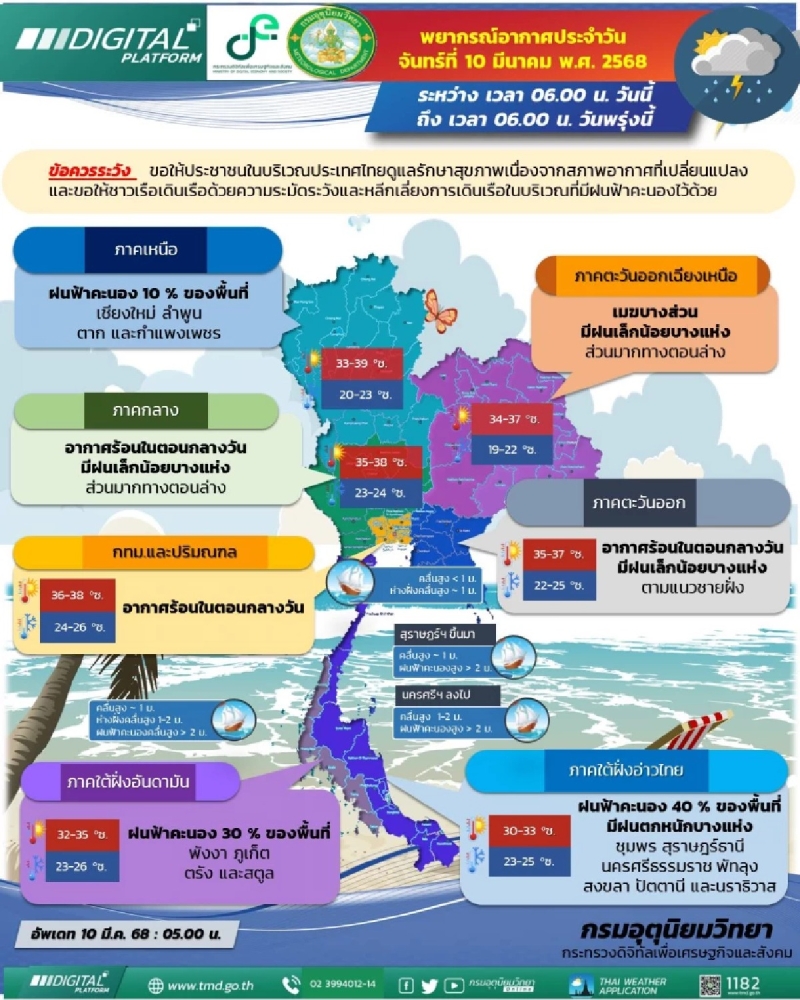 กรมอุตุนิยมวิทยาคาดการณ์ว่า ภายใน 24 ชั่วโมงข้างหน้า อุณหภูมิในประเทศไทยตอนบนจะสูงขึ้น โดยมีอากาศร้อนในช่วงกลางวัน และอาจมีฝนเล็กน้อยบางแห่ง ขณะที่ภาคใต้ยังคงมีฝนตกหนักบางพื้นที่