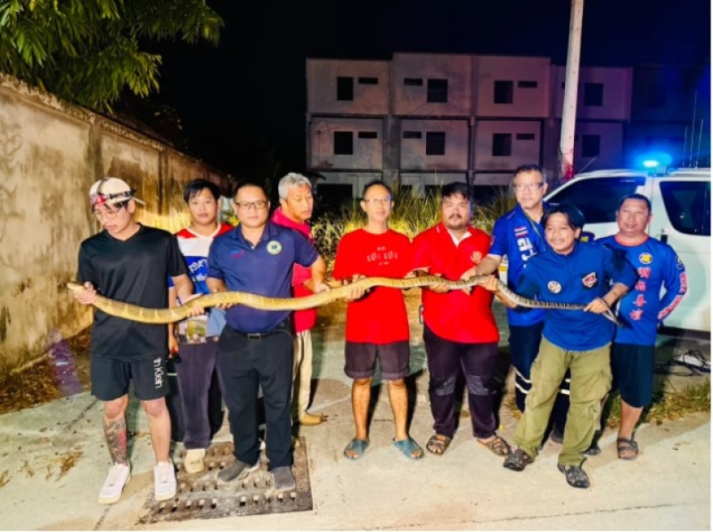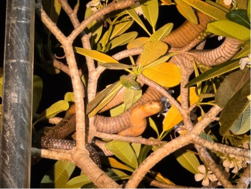 วันที่ 11 มี.ค. 68 ผู้สื่อข่าวรายงานว่า ชาวบ้านในพื้นที่หลังตลาดนัดคุณเชาว์ หมู่ 4 ตำบลทับมา อำเภอเมือง จังหวัดระยอง พบงูจงอางเลื้อยขึ้นศาลพระภูมิ ต่างพากันถ่ายคลิปและแชร์ต่อกันในโลกออนไลน์อย่างรวดเร็ว ก่อนจะประสานเจ้าหน้าที่กู้ภัยและทีมพิทักษ์อสรพิษจังหวัดระยอง เข้าตรวจสอบพื้นที่ พร้อมใช้ไม้ไล่ต้อนให้งูจงอางยาวเกือบ 4 เมตร ลงมาจากต้นไม้ ก่อนจับตัวไว้ได้อย่างปลอดภัย