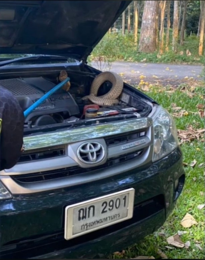 เมื่อเช้าวันที่ 13 มี.ค.68 เจ้าหน้าที่มูลนิธิสยามรวมใจปู่อินทร์ จ.นครศรีธรรมราช รับแจ้งขอความช่วยเหลอืจากชาวบ้านเขานา ว่ามีงูจงอางซุกห้องเครื่องรถกระบะภายในสวนยางพารา พื้นที่หมู่ 3 บ้านเขานา ต.ทุ่งโพธิ์ อ.จุฬาภรณ์ จึงเดินทางไปตรวจสอบ ที่เกิดเหตในสวนยางพาราพบเจ้าของรถ ยืนรอเจ้าหน้าที่ด้วยสีหน้าตาตื่น ก่อนจะแจ้งว่าในห้องเครื่องกระบะยี่ห้อโตโยต้า สีดำ ทะเบียน ฌก 2901 กรุงเทพ มีงูจงอางขนาดใหญ่ซุกอยู่