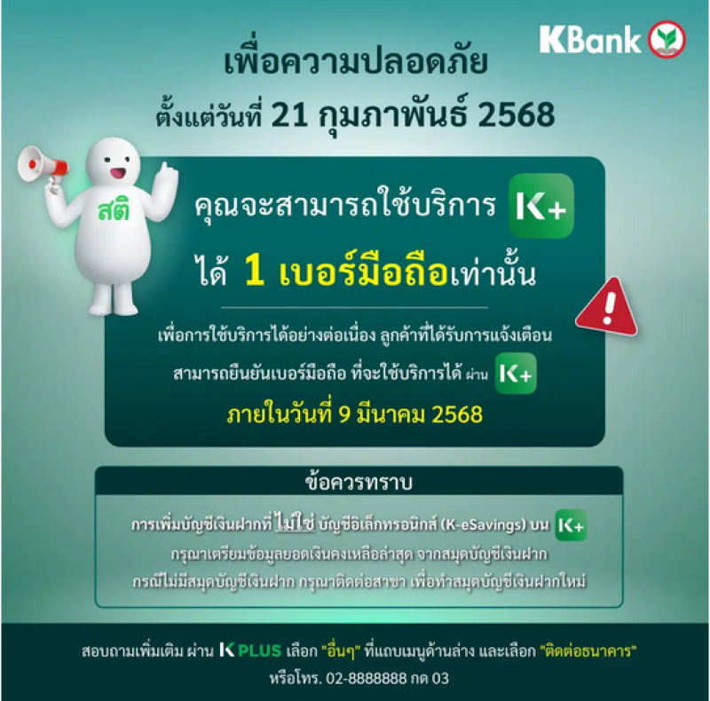 ตามประกาศจากเพจเฟซบุ๊ก KBank Live ระบุว่า ธนาคารฯ กำหนดให้ลูกค้า K PLUS สามารถผูกบัญชีและใช้บริการได้กับหมายเลขโทรศัพท์มือถือเพียงหมายเลขเดียวเท่านั้น สำหรับลูกค้าที่ได้รับการแจ้งเตือนให้ยืนยันเบอร์มือถือ สามารถดำเนินการได้ง่ายๆ ผ่านหน้าแอปพลิเคชัน K PLUS ก่อนเริ่มใช้งาน ตามขั้นตอนที่ปรากฏบนหน้าจอ