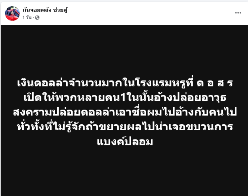 เรียกได้ว่ากำลังเป็นประเด็นร้อนแรงเลยทีเดียวที่ล่าสุดทางด้าน กัน จอมพลัง ได้ออกมาเปิดปมถึงดาราสาวผ่านทางเฟซบุ๊ค กันจอมพลัง ช่วยสู้ ระบุว่า เงินดอลล่าจำนวนมากในโรงแรมหรูที่ ด อ ส ร เปิดให้พวกหลายคน 1 ในนั้นอ้างปล่อยอาวุธสงคราม ปล่อยดอลล่าเอาชื่อผมไปอ้างกับคนไปทั่วทั้งที่ไม่รู้จักถ้าขยายผลไปน่าเจอขบวนการแบงค์ปลอม