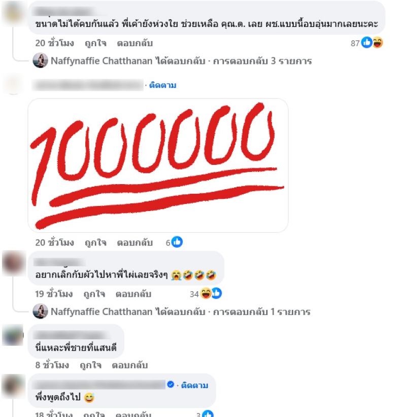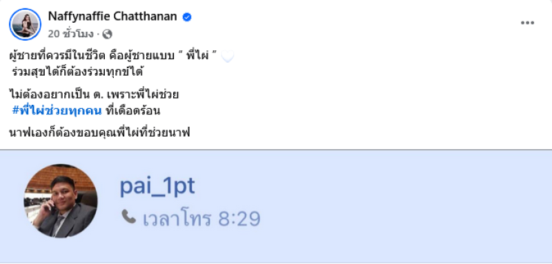 เรียกได้ว่าเป็นอีกหนึ่งอินฟลูสาวดังสำหรับ นาฟ ฉัฐนันท์ หลาน แพท ณปภา ตันตระกูล ล่าสุดได้ออกมาโพสต์ข้อความถึง ไผ่ลิกค์ ผ่านทางเฟซบุ๊ค Naffynaffie Chatthanan พร้อมเผยภาพการโทรกับไผ่ลิกค์ ระบุเเคปชั่นว่า ผู้ชายที่ควรมีในชีวิต คือผู้ชายแบบ พี่ไผ่ ร่วมสุขได้ก็ต้องร่วมทุกข์ได้ ไม่ต้องอยากเป็น ด. เพราะพี่ไผ่ช่วย #พี่ไผ่ช่วยทุกคน ที่เดือดร้อน นาฟเองก็ต้องขอบคุณพี่ไผ่ที่ช่วยนาฟ