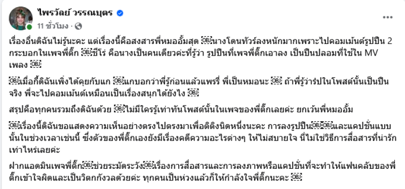 ล่าสุดทางด้าน แพรรี่ ไพรวัลย์ ได้ออกมาโพสต์ถึงประเด็นดังกล่าวผ่านทางเฟซบุ๊ค ไพรวัลย์ วรรณบุตร โดยเผยว่า เรื่องอื่นดิฉันไม่รู้นะคะ แต่เรื่องนี้คือสงสารพี่หมออั้มสุด นางโดนทัวร์ลงหนักมากเพราะไปคอมเม้นต์รูปปืน 2 กระบอกในเพจพี่ติ๊ก ชีโร่ คือนางเป็นคนเดียวค่ะที่รู้ว่า รูปปืนที่เพจพี่ติ๊กเอาลง เป็นปืนปลอมที่ใช้ใน MV เพลง